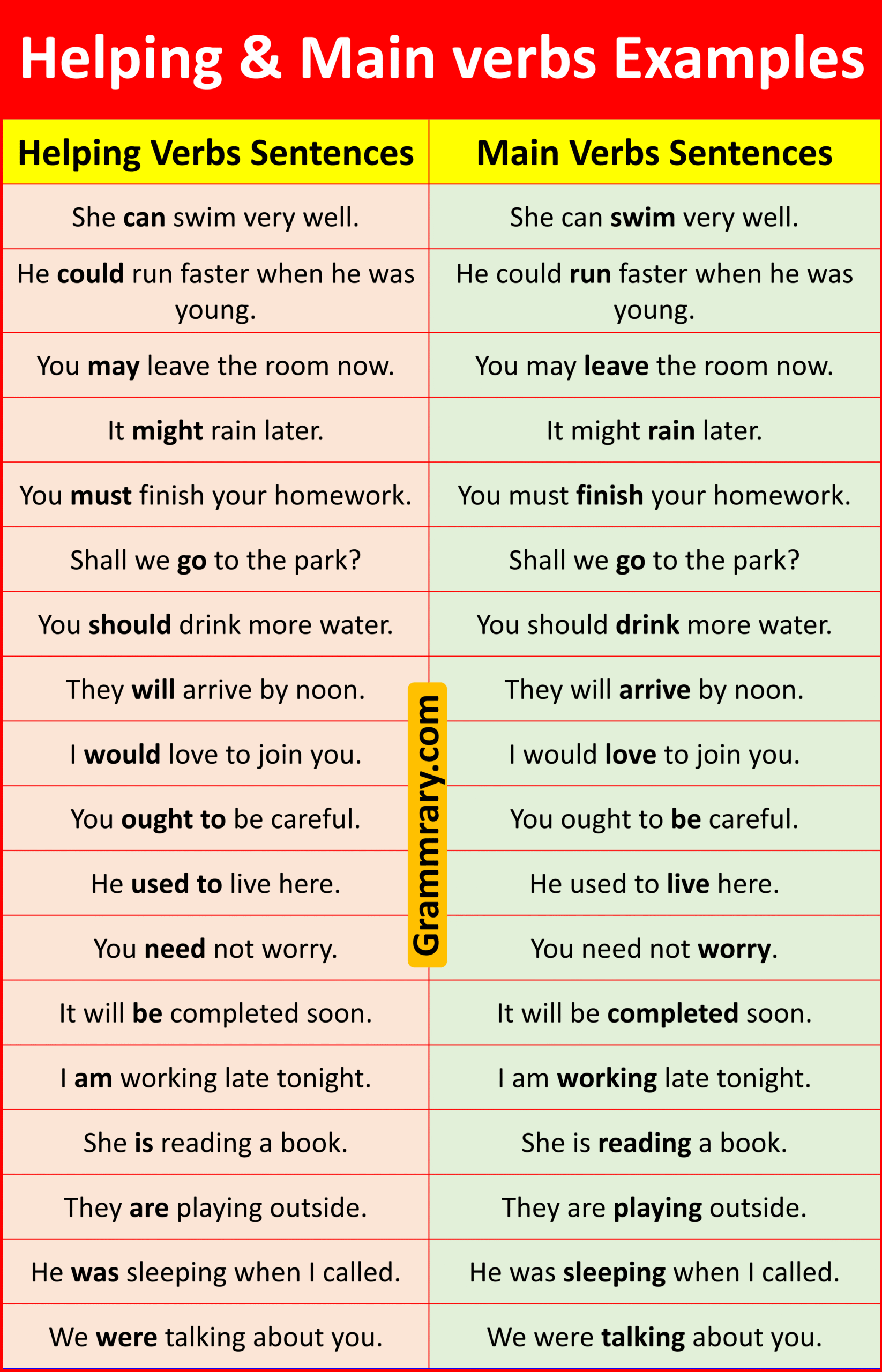 | Helping Verbs Sentences | Main Verbs Sentences |
